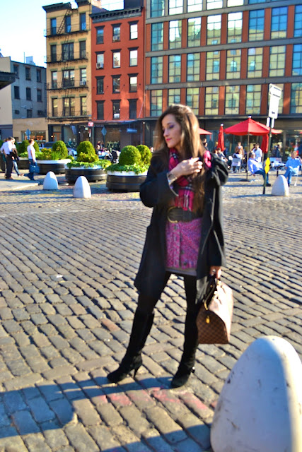 Here, I am wearing a long and colorful pink sweater belted with a thick black belt (beneath, I am wearing a gray dress). I have coupled the pink sweater with a pink Burberry scarf. I am wearing a long (light) black coat with flowers imprinted on it. My stalkings are opaque black and my boots are black (suede). For my bag, I chose the roomy Luis Vuitton speedy. For my make-up, I am wearing bold pink gloss coupled with sparkly purple eyeshadow.
