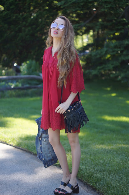 The shape of the glasses is not the typical aviator, and I find this refreshing; I also love the platinum color as it easily matches different pieces in my wardrobe. I combined my new mirrored sunglasses with a bohemian red dress, a denim vest, and a fringe bucket back I acquired recently. Seventies style has always been my favorite, and this combination of fringe and mirrored glasses is something I will probably continue to wear into the fall and winter.